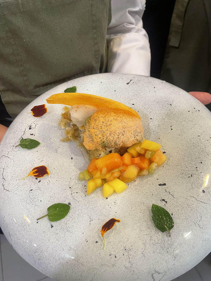 - Colocar el sorbete de limón con menta en el otro lado del plato.